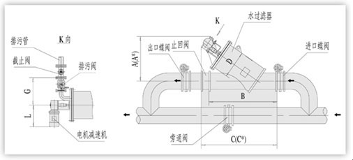 | 型號(hào) | 管徑 (mm) | 過(guò)濾流量 (m3/h) | 過(guò)濾面積 (cm3) | 排污閥DN (mm) | 一次清洗 水量(L) | 電機(jī)功率 (KW) | 重量 (Kg) | D (mm) | A (mm) | A (mm) | B (mm) | C (mm) | C (mm) | L (mm) | G (mm) |