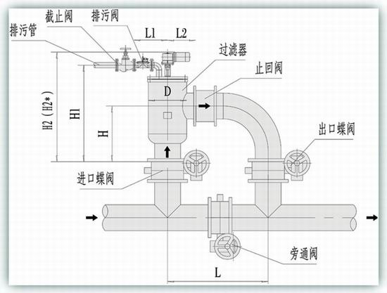 | 型號(hào) | 管徑 (mm) | 過(guò)濾 流量 (m3/h) | 過(guò)濾 面積 (cm2) | 排污 閥DN (mm) | 一次清 洗水量 (L) | 電機(jī) 功率 (KW) | 重量 (Kg) | D (mm) | H (mm) | H1 (mm) | H2 (mm) | H2 (mm) | L1 (mm) | L2 (mm) | L (mm) |