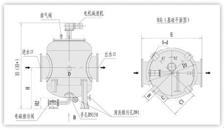 | 型號(hào) | 管徑 mm | 過(guò)濾 流量 m3/h | 過(guò)濾面積 cm2 | 電磁排污閥DN1 mm | 一次清洗水量L | 清洗排污閥DN1 mm | 電機(jī)功率 KW | 重量 Kg | D mm | H mm | H1 mm | H1 mm | H2 mm | E mm | D1 mm | B mm | C mm | C1 mm | D mm |